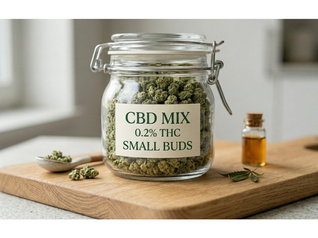 Zmes drobných konopných kvetov z troch známych odrôd – CBD Kush, Super Lemon Haze a Blackberry Kush. V baleniach s hmotnosťou 5 alebo 10 g nájdete menšie kvety, ktorých obsah THC je najviac 0,2 %.