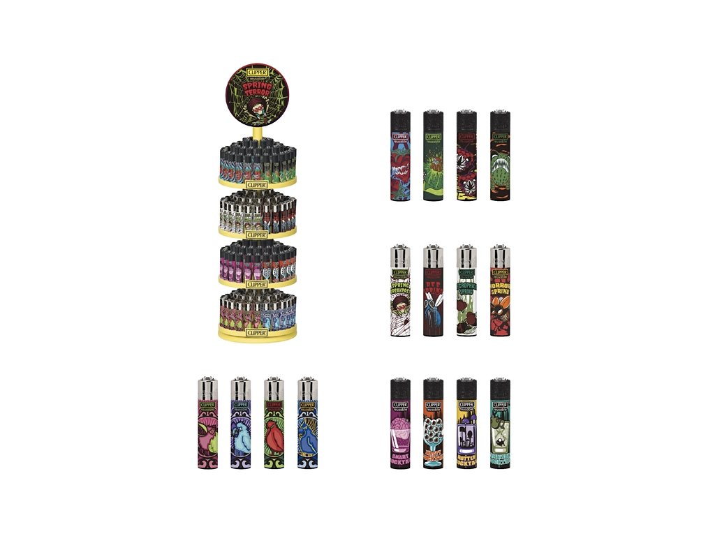 Zapaľovače Clipper zo zberateľskej kolekcie s názvom Spring Terror 1. Zapaľovače sú potlačené obrázkami strašidelných plodov z jarnej záhradky v 4 rôznych prevedeniach.