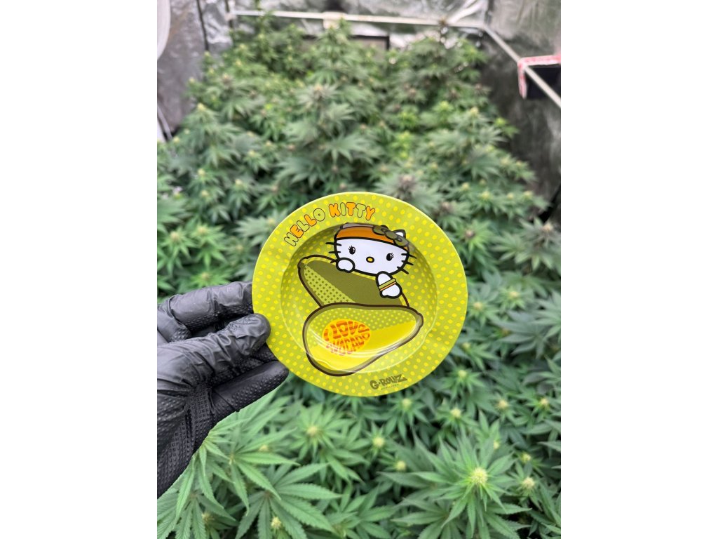 Kovový popolník s motívom Hello Kitty Avocado a priemerom 13,5 cm.
