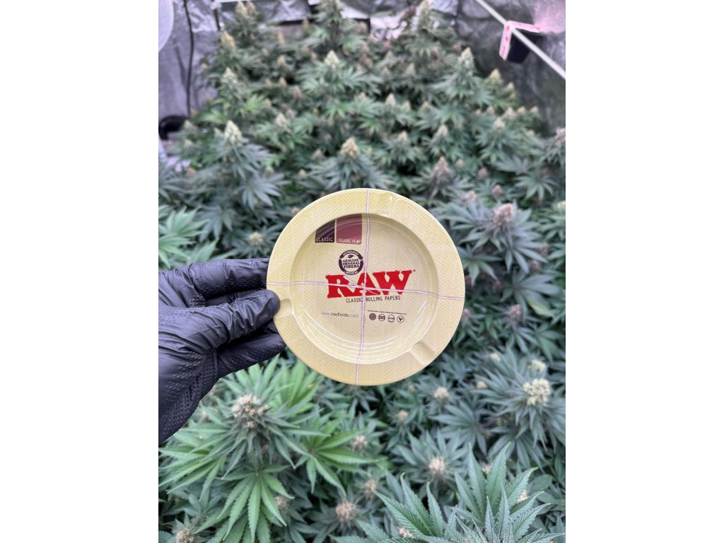 Kovový popolník s motívom značky 'RAW' s priemerom 140 mm.