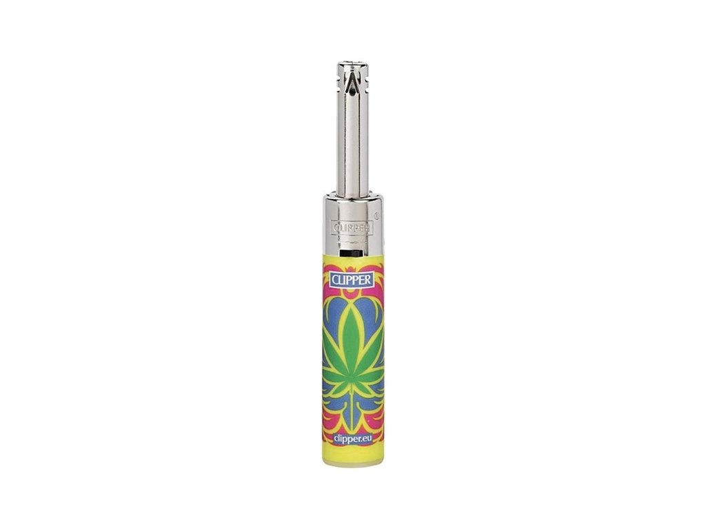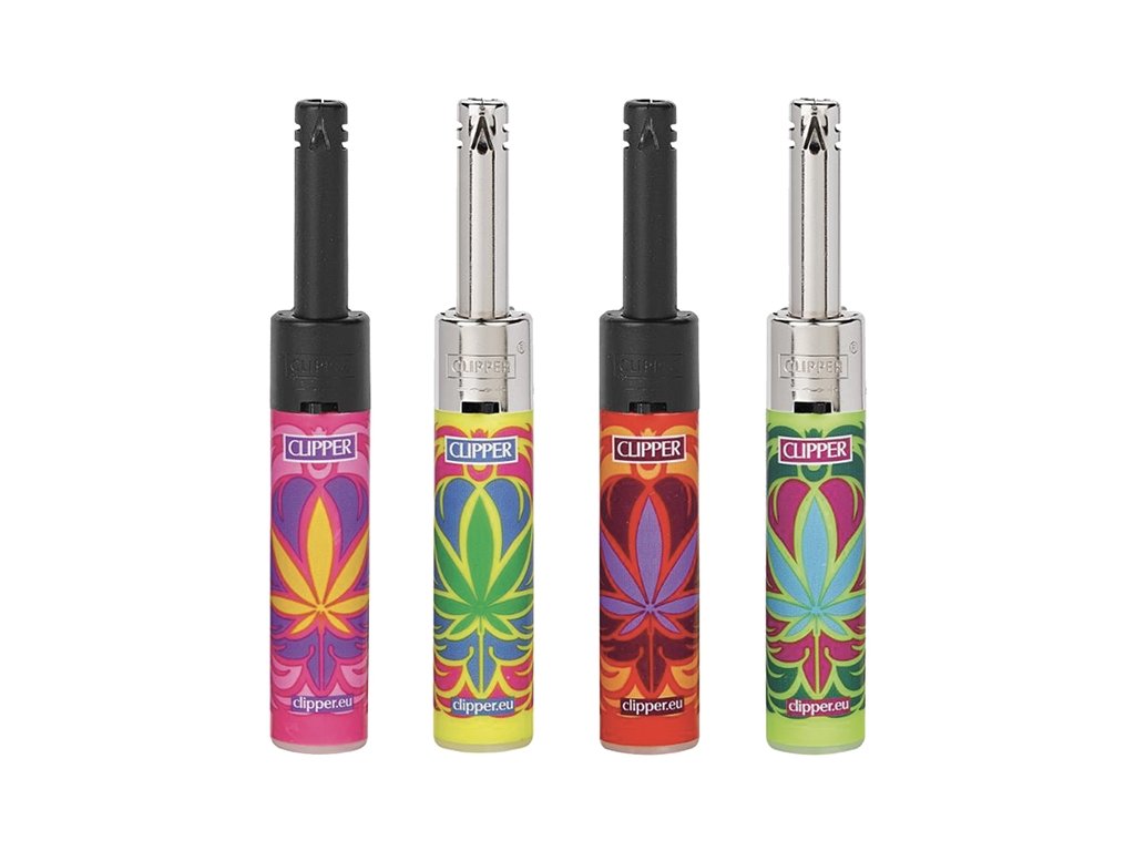 Celá sada Clipper zapaľovačov Mini-tube s predĺženou hlavicou as potlačou konopných listov.