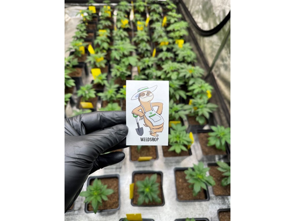 Túto aj všetky ostatné samolepky bežne dávame k väčším nákupom, ale pre veľký záujem sme sa rozhodli umožniť ich predaj aj cez náš e-shop. Na samolepke nájdete nášho typického leňochoda, ktorý je zhulený a obstaráva svoju konopnú záhradku.