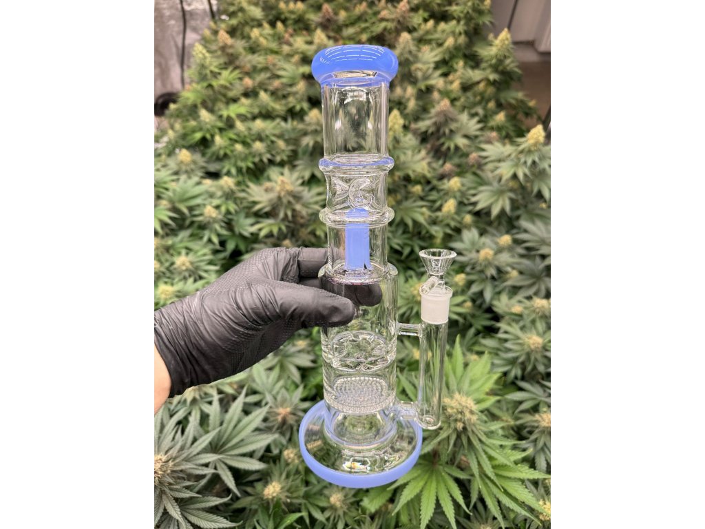 Prvá perkolácia je najobľúbenejšia a všetkým dobre známa. Je to Honeycomb perkolácia, ktorá dokáže najviac zjemniť dym zo všetkých dostupných perkolácií. Ďalším je Cutter a potom v neposlednom rade Dome perkolácia, ktorá je vždy v príslušnej farbe bongu. Samotný bong je vysoký 30 cm, vyrobený zo skla hr. 5 mm a nadchne každého, kto hľadá bong s viacerými perkoláciami a zároveň sklenený bong za super cenu. Je doplnený o sklenený kotlík s veľkosťou 14,5 mm, ktorá má praktickú úchytku.