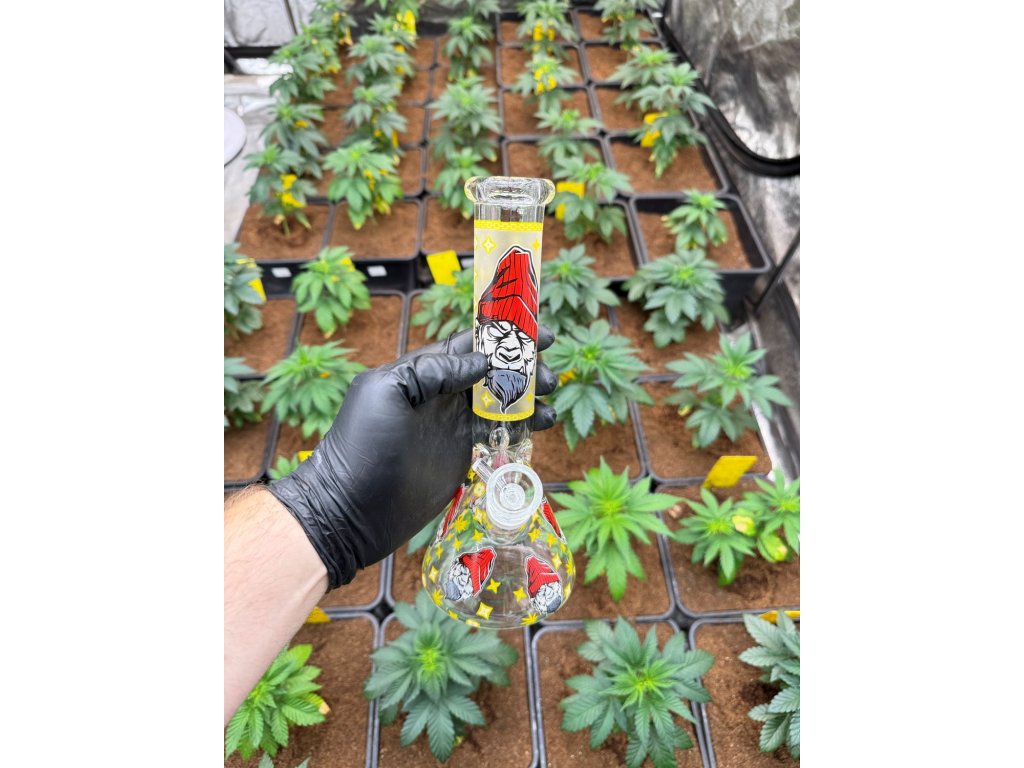 Sklenený Ice-bong s výškou 25 cm vyrobený z pevného skla s krásnym dizajnom čiernej opice s červenou čiapkou a malými obrázkami hviezd a konopných listov, to všetko v žltej farbe. Malý, veľmi kvalitný sklenený bong s priemerom kotlíka 14,5 mm, do ktorého ľahko vsadíte dodatočný precooler či iné príslušenstvo. Adaptér má tzv. zúžený zábrus a to z vonkajšieho priemeru 18,8 mm na 14,5 mm.