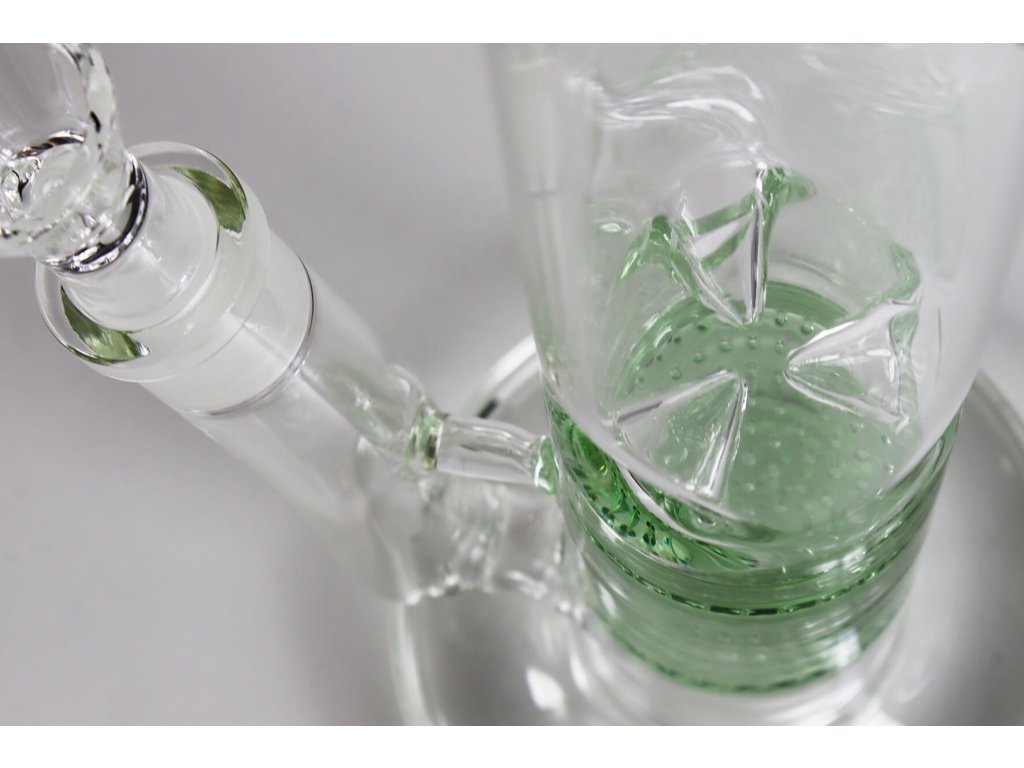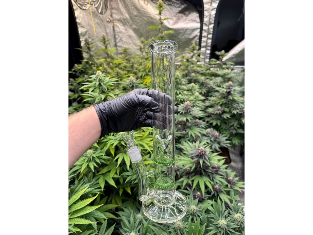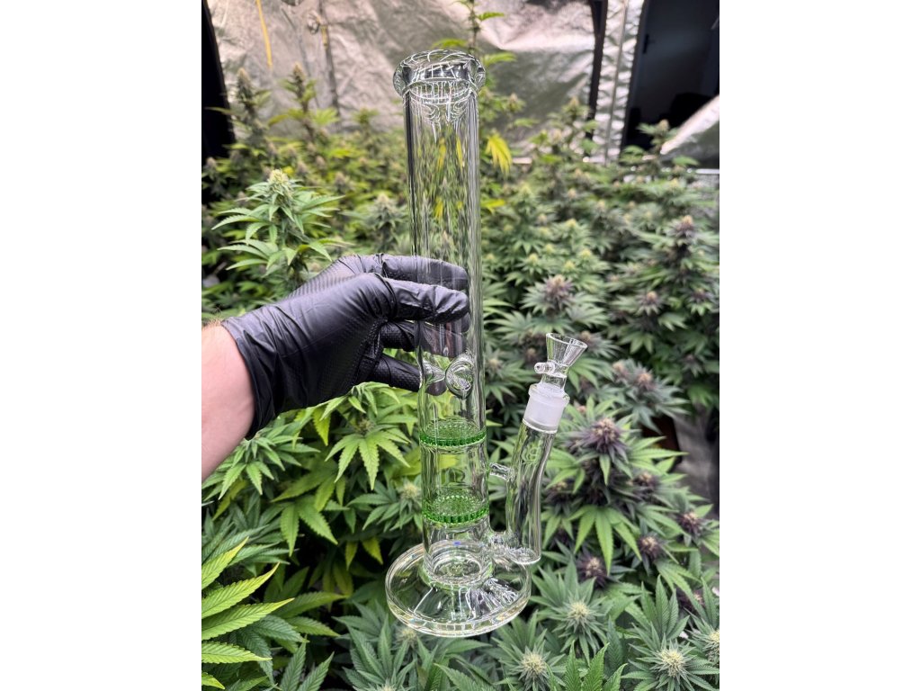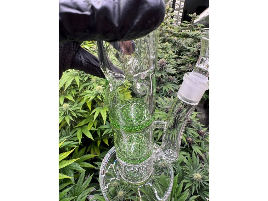Skleněný bong se dvěma HoneyComb perkolátory v zelené barvě, vysoký 38 cm se zábrusy na led.