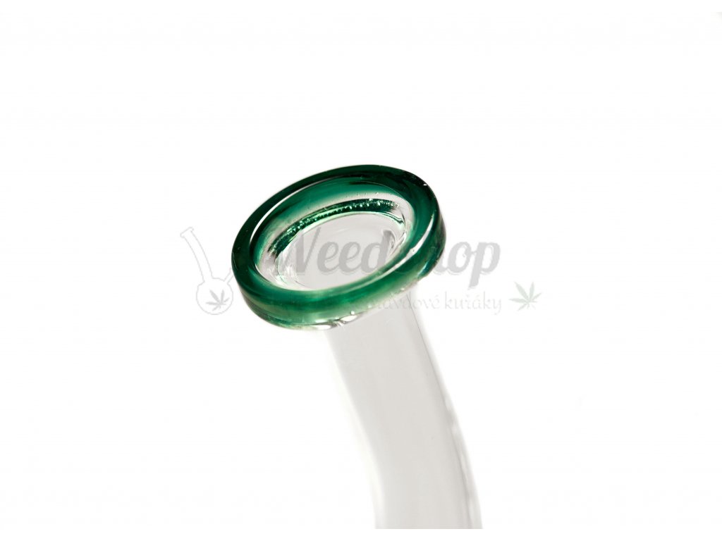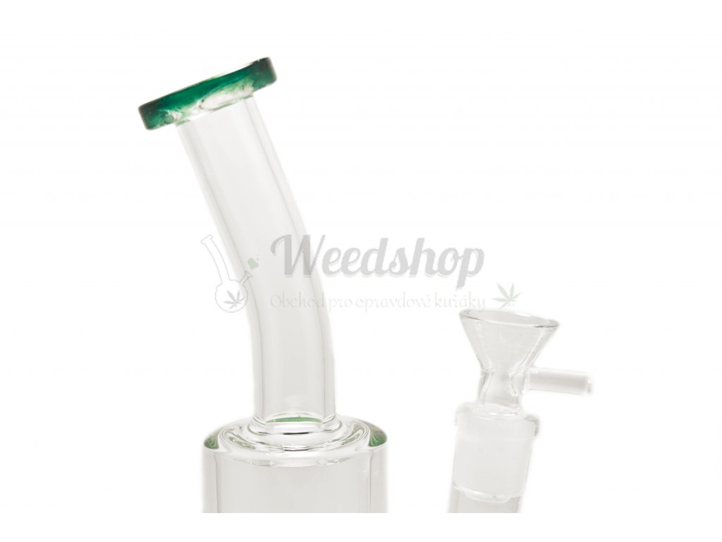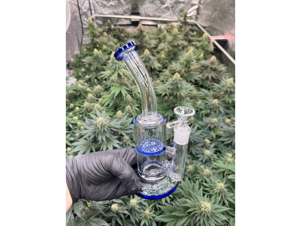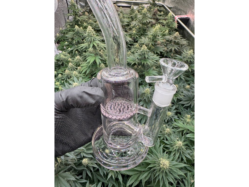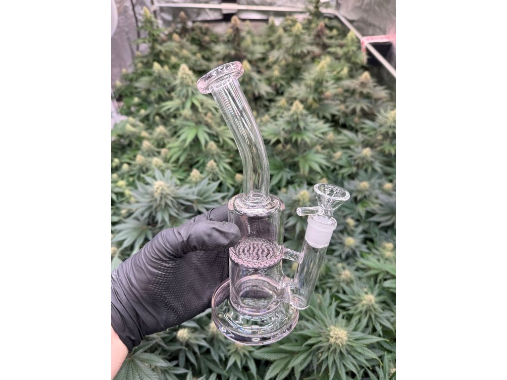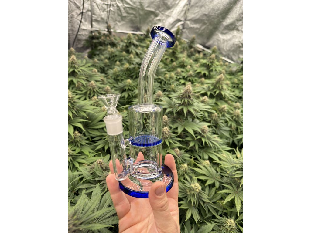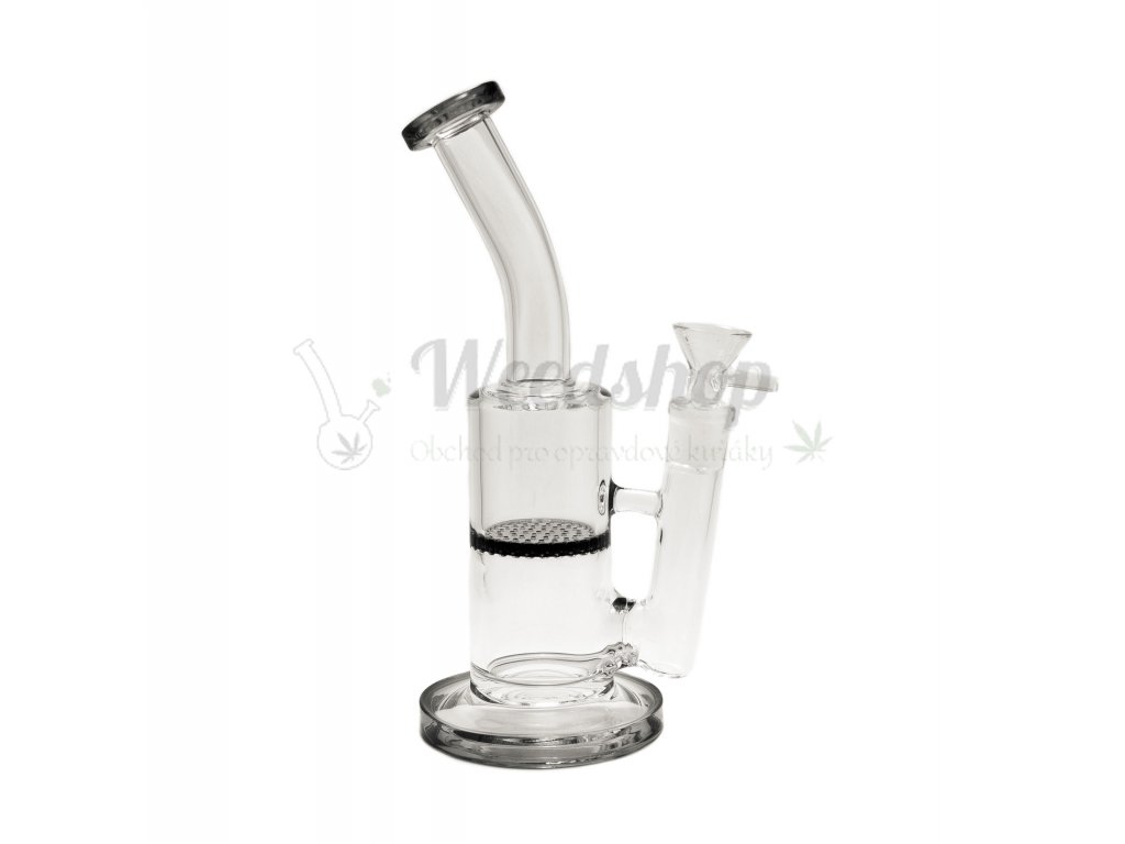 Sklenený bong menšej veľkosti s veľmi obľúbenou honeycomb perkoláciou. Sklenená bongá s honeycomb perkoláciou patrí medzi jednu z najlepších pretože dokáže spoľahlivo schladiť hutný dym. Pri tomto bongu nájdete sklenený kotlík s praktickým držadlom. Tento bong menšej veľkosti si môžete vziať všade so sebou a hodí sa tak aj ako malý darček, či diskrétny bong, ktorý sa vďaka perkolácii vyrovná aj bongom väčšej veľkosti.
