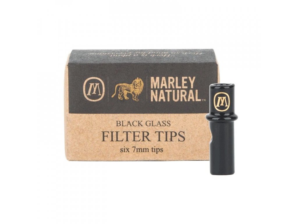 Sklenené filtre značky Marley Natural s priemerom 7 mm, vyrobené z čierneho/dymového skla. V balení nájdete 6 kusov filtrov na fajčenie.