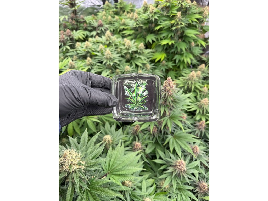 Sklenený popolník v hranatom prevedení o rozmere 9 x 9 cm s konopnými motívmi.
