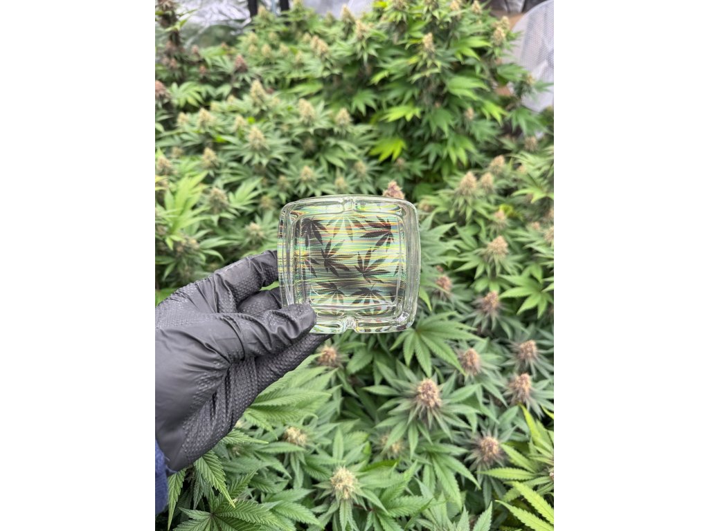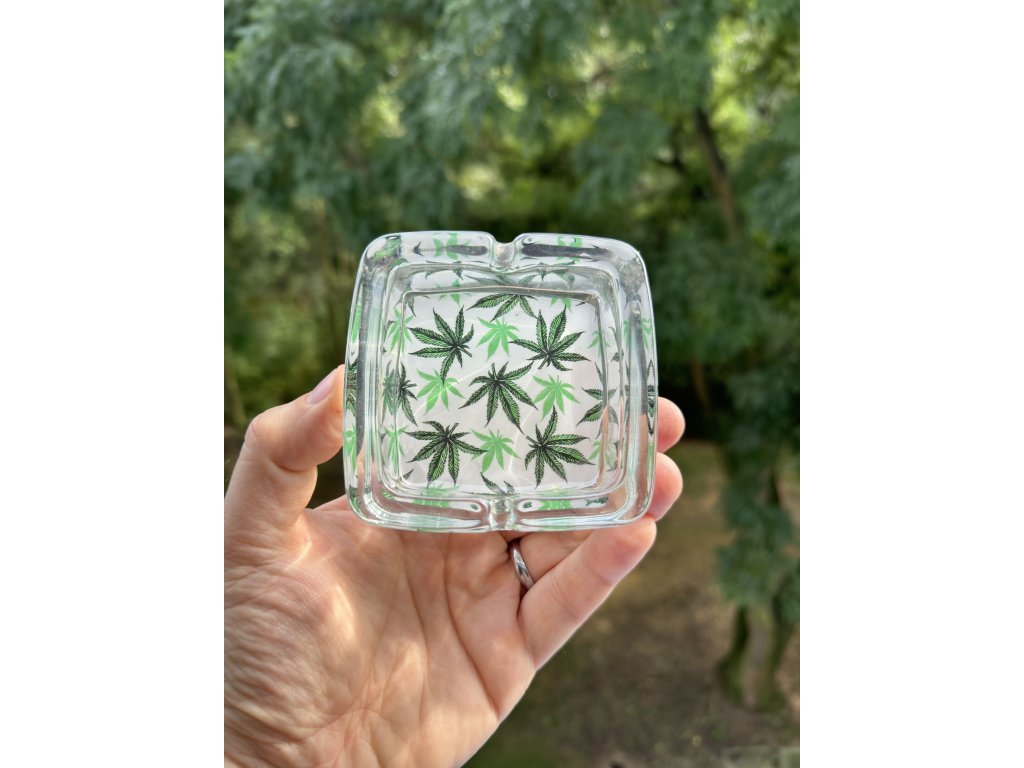 Sklenený popolník v okrúhlom prevedení o rozmere 9 x 9 cm s konopnými motívmi.