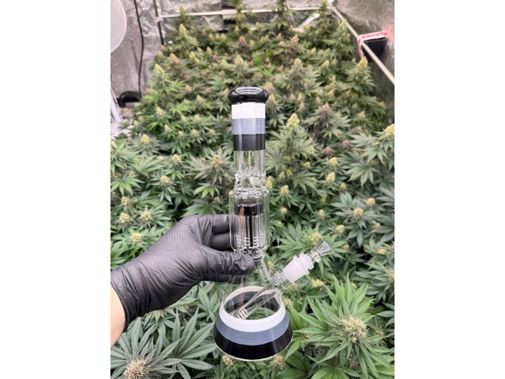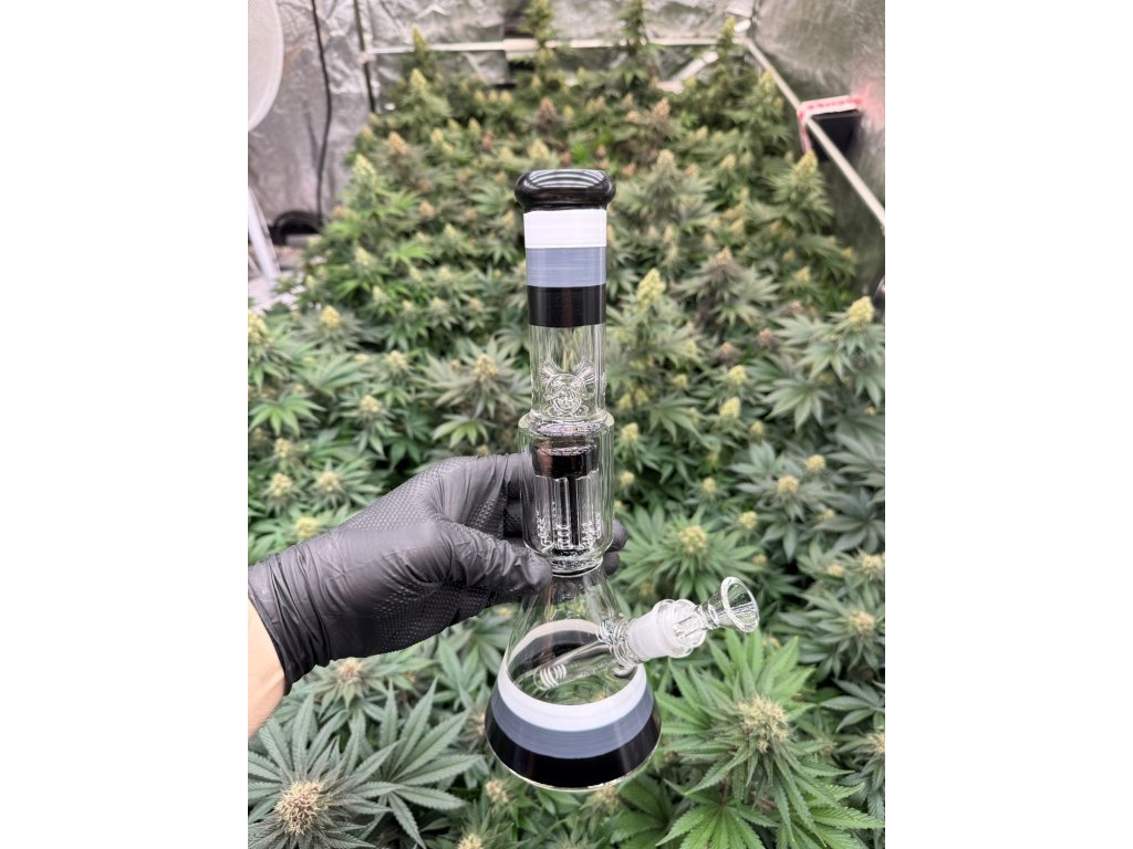 Sklenený bong bez loga z 5mm skla s 8-arm perkoláciou. Tento sklenený bong môžete vďaka zárezom na ľad v trubici naplniť ľadom pre ešte lepší a chladivý efekt pri každom fajčení. Bong čírej farby je doplnený o čierne detaily. Tento sklenený bong má adaptér hr. 18,8 mm s diffuzorem a ďalej tu nájdete sklenený kotlík s rozmerom 14,5 mm ktorý je doplnený o praktickú sklenenú úchytku, ktorá uľahčí manipuláciu s horúcim kotlom.