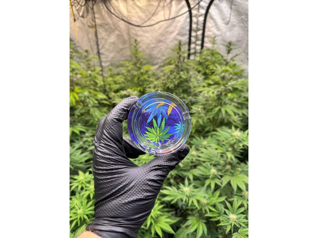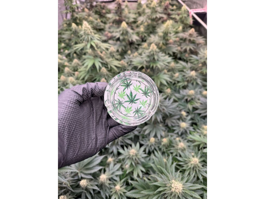 Sklenený popolník v okrúhlom prevedení s priemerom 9 cm s konopnými motívmi.