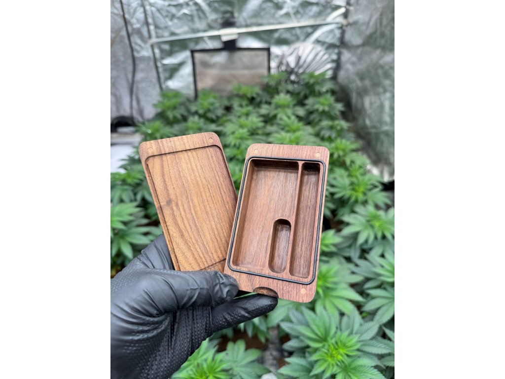 Malá luxusná drevená schovka z orechového dreva s perforáciou na základné fajčiarske potreby, ako sú cigaretové papieriky, filtre, sklenenku či predtočený joint.